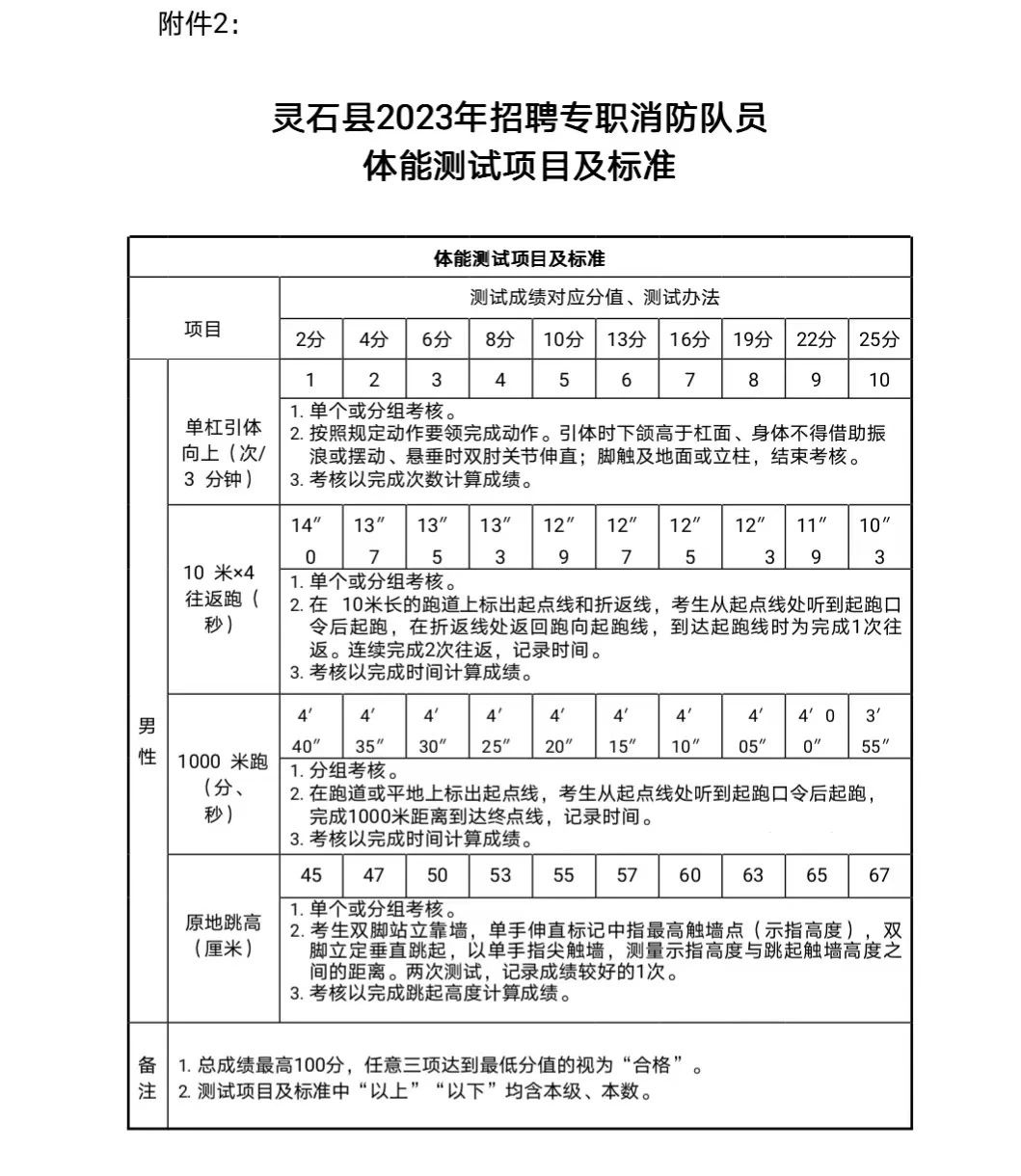 體能測試參照《國家綜合性消防救援隊(duì)伍消防員招錄體能測試項(xiàng)目及標(biāo)準(zhǔn)》執(zhí)行,體能測試實(shí)行量化評分,單項(xiàng)設(shè)最高分25分,體能測試成績滿分為100分,體能測試成績占總成績的70%,具體測試項(xiàng)目及評分標(biāo)準(zhǔn)詳見附件2。